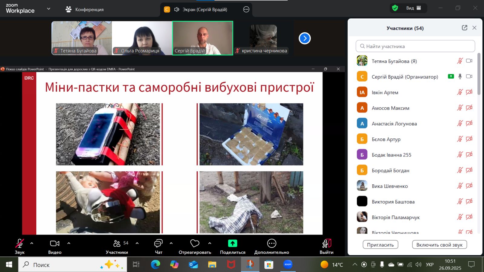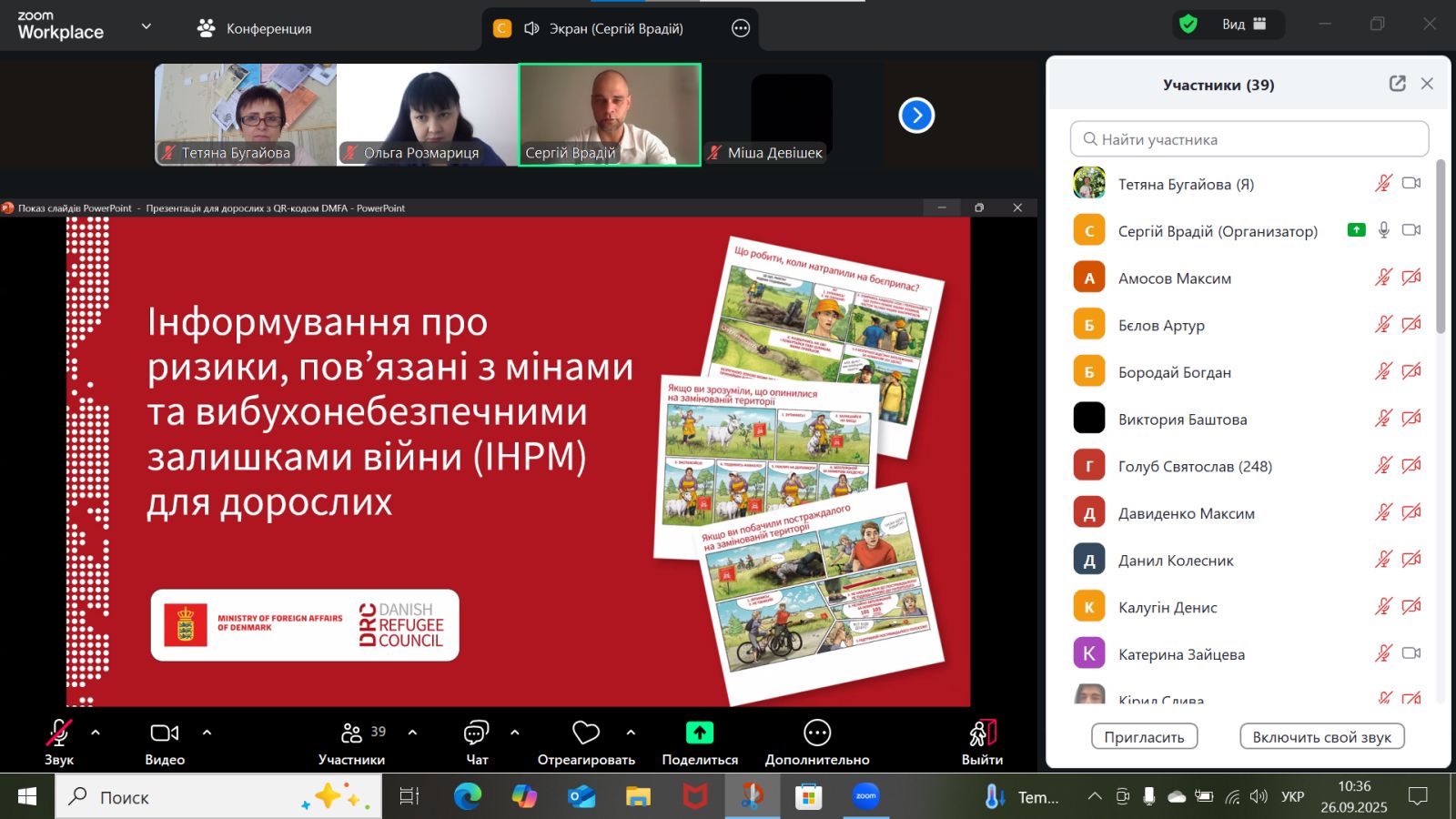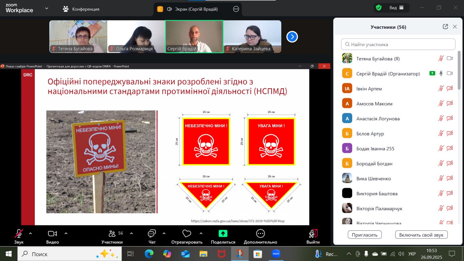 26 вересня у дистанційному форматі відбулася зустріч студентів зі спеціалістами з гуманітарного розмінування Данської ради у справах біженців (DRC), які вже багато років працюють у різних країнах світу, зокрема й в Україні, щоб зменшити небезпеку від вибухонебезпечних предметів.