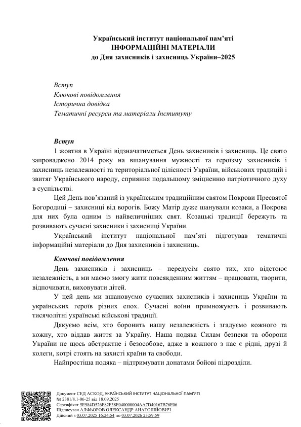 ВИКЛАДАЧАМ, КЛАСНИМ КЕРІВНИКАМ! Для використання в роботі матеріали Українського інституту національної пам’яті щодо відзначення Дня захисників та захисниць України, вшанування мужності та героїзму борців за незалежність і територіальну цілісність України, військових традицій і звитяг українського народу.