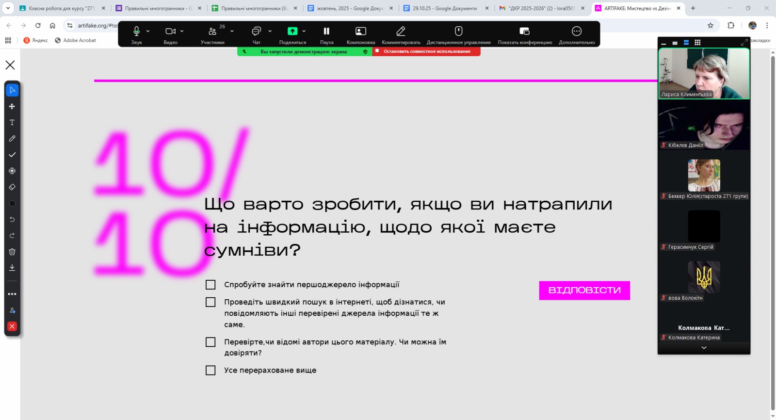 Під час заходу студенти ознайомилися з поняттями «медіа», «фейки», «маніпуляція», «інформаційна безпека», обговорили актуальні приклади інформаційних впливів у соціальних мережах та навчалися розпізнавати неправдиві повідомлення.