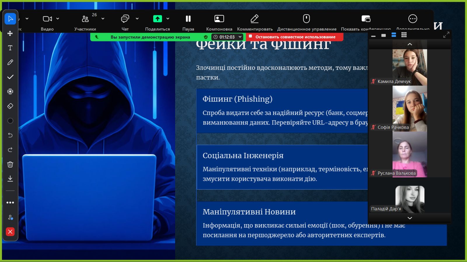 Під час заняття здобувачі освіти ознайомилися з поняттями інформаційна безпека та інформаційна гігієна, дізналися про способи розпізнавання неправдивої інформації, правила створення надійних паролів і захисту особистих даних, а також алгоритм дій у разі кіберзагроз чи шахрайства в мережі.