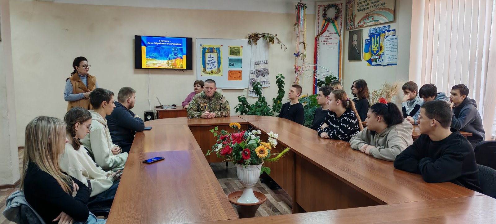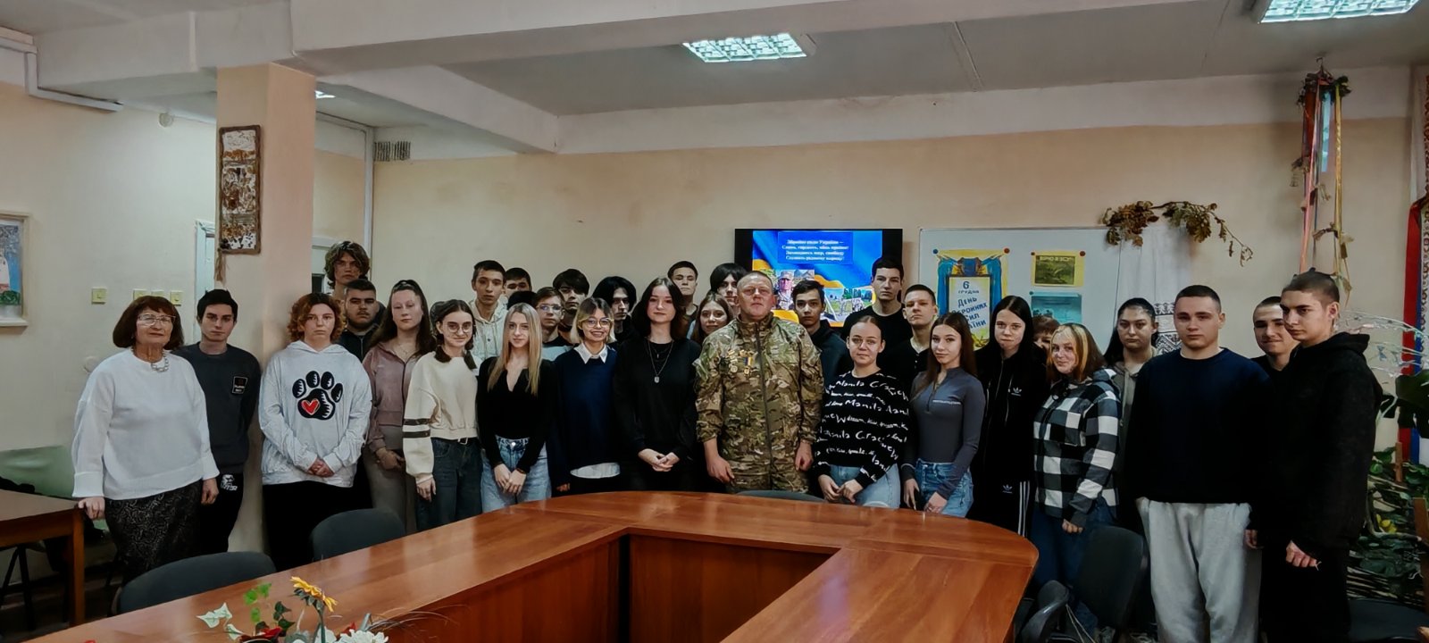 У бібліотеці нашого навчального закладу відбулася важлива й емоційно насичена зустріч зі справжнім героєм — учасником бойових дій, ветераном війни та нашим колегою, керівником фізичного виховання Сергієм Мирославовичем Федорчаком. Захід став живим уроком мужності для студентської молоді.